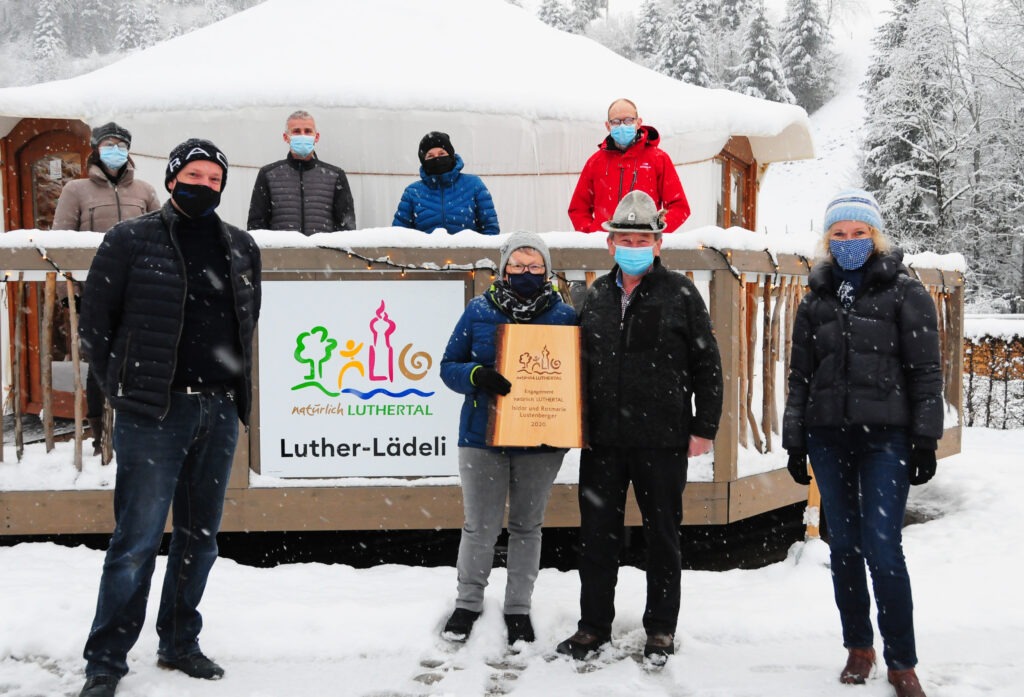 Die Preisübergabe durch Daniel Gander, Präsident und Iris Isenschmid, Geschäftsführerin von natürlich LUTHERTAL fand Corona-konform im Schneegestöber statt. Der Laudator Pi Häfliger, Präsident des Fördervereins Luthern Bad, würdigte Romy Lustenberger, langjährige Vizepräsidentin des Fördervereins und ihren Mann Isidor mit den Worten „sie tragen Luthern Bad im Herzen“.
